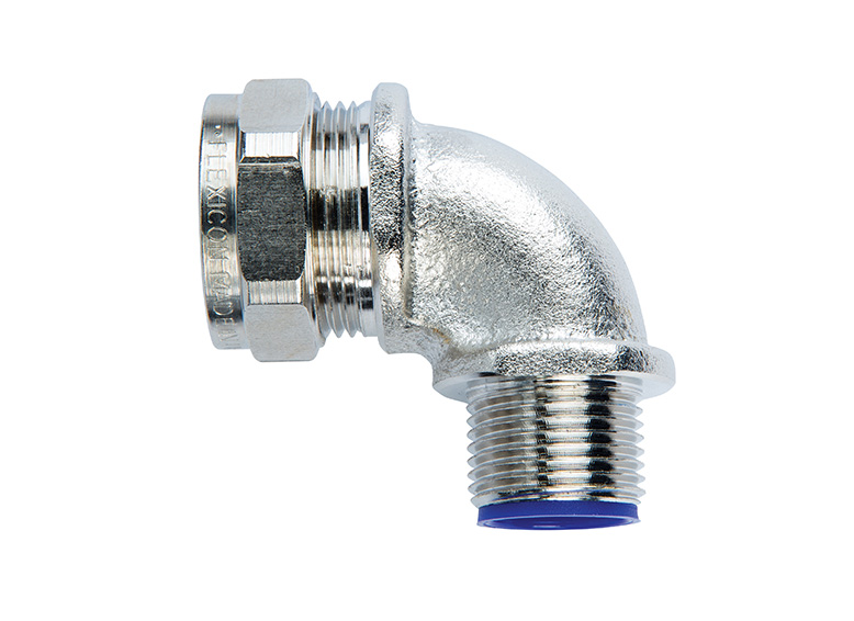 Raccordo a 90° LTP-C90 in ottone nichelato maschio e guarnizione in elastometro