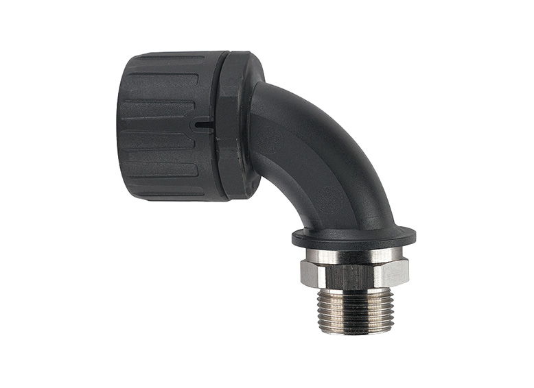 Raccordo a 90° FPA90-BU in nylon con filettatura femmina in ottone nichelato