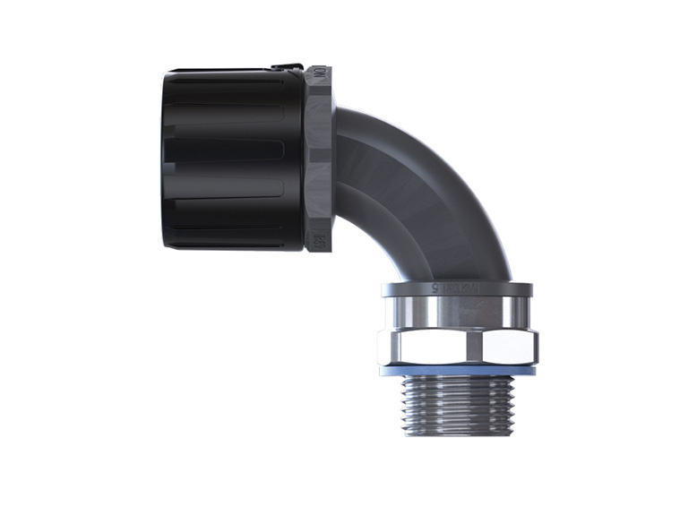 Raccordo a 90° FPAU90-B in nylon con filettatura maschio in ottone nichelato con guarnizione