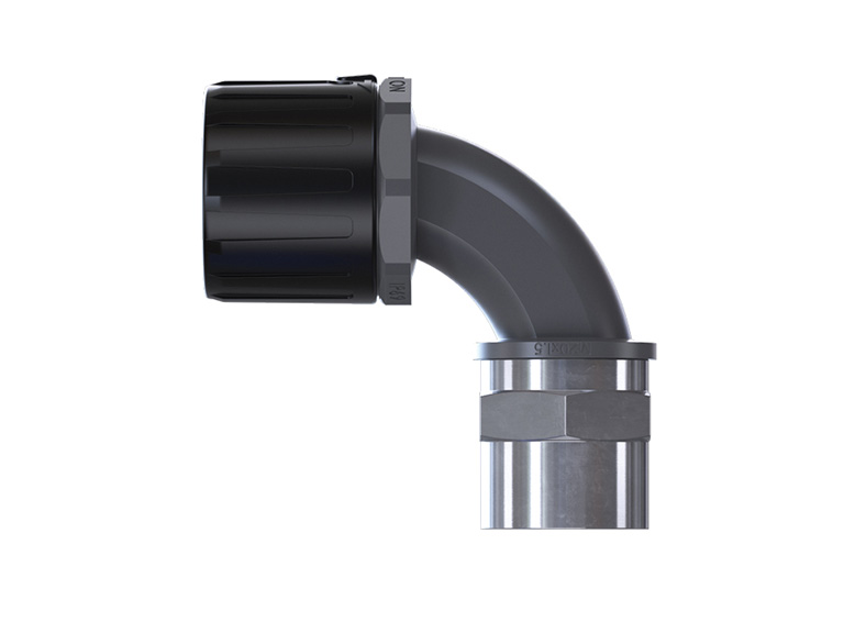 Raccordo a 90° FPAU90-BFM in nylon con filettatura femmina in ottone nichelato e guarnizione
